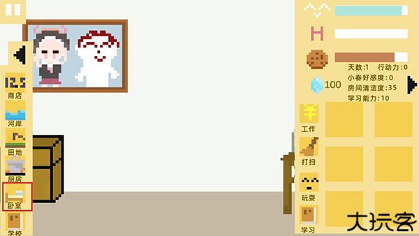 7、如果当天体力被消耗完,左下角打开地点面板,前往卧室,点击床,即可睡觉进入下一天