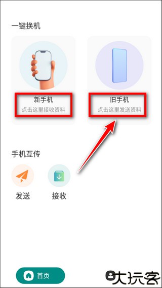 2、想要发送资料的一方点击右边的“旧手机”,想要接受资料的一方点击左边的“新手机”