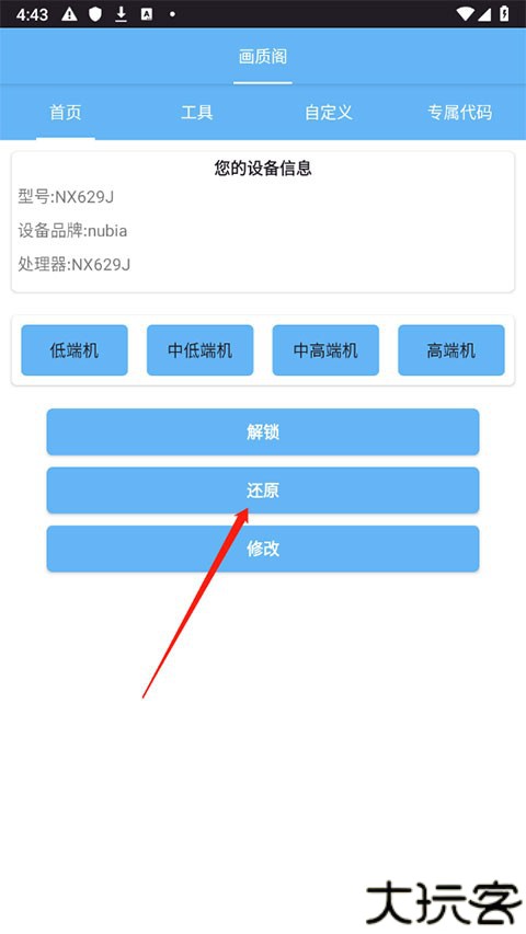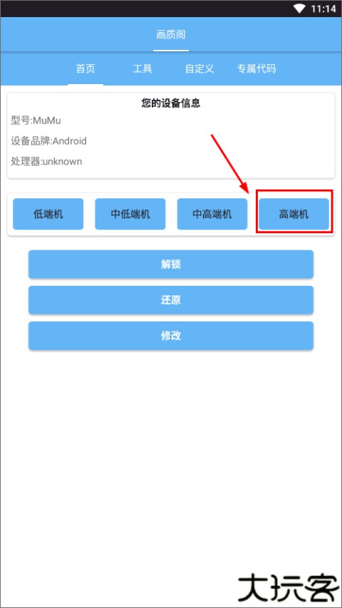 1、在爱游戏网下载画质阁,进入首页会自动检测我们的设备,用户可根据自身手机配置进行选择,如高端机;