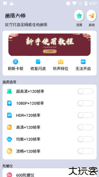 画质大师120帧一键解锁版是一款简单好用的吃鸡游戏画质助手,不少玩家想体验更高画质和帧数,原版游戏有帧数的限制使用这款软件可以突破最高支持120帧。画质大师内置了多样的方案可以一键解锁使用,除了解锁画质外支持修复闪退刷新卡顿提升游戏运行稳定度,是一款简单好用的游戏助手欢迎小伙伴下载体验。
