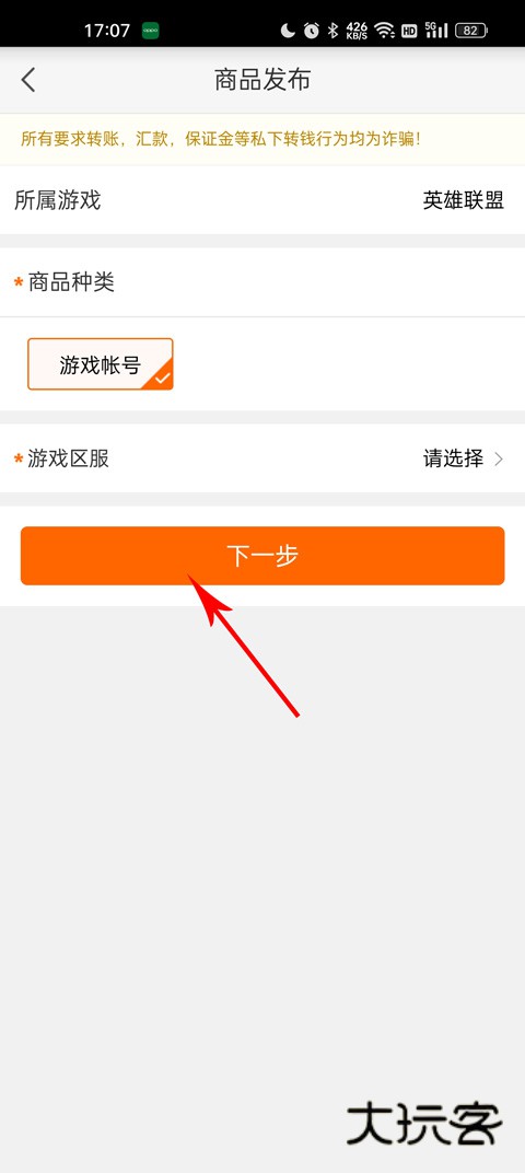 4、进入之后,选择所属游戏、商品种类、游戏区服,然后点击下一步即可;