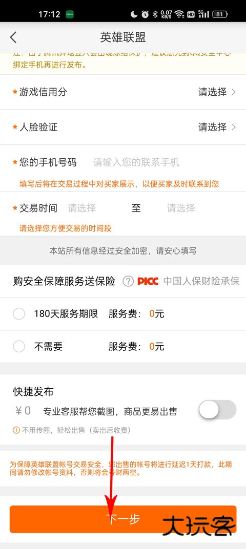 5、选择下一步之后,你会来到账号的详细信息页面,你需要填写商品类型、游戏区服、微信号、商品标题、出售价格、账号来源、等级、英雄数量、皮肤数量、单双排段位、游戏账号和密码、以及你的手机号,交易时间和游戏信用分,填写完毕之后点击下一步,就可以等待其他玩家来下单了。