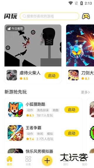 1、下载闪玩并打开软件,在首页可以看到许许多多的热门游戏;