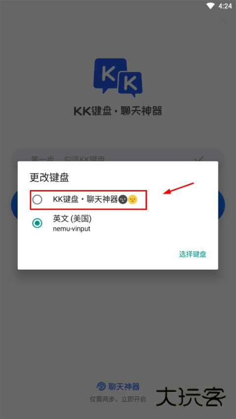 接下来选择下方的“切换到KK键盘”功能,就可以选择“KK键盘”作为手机默认的输入法了;