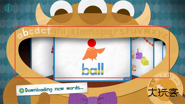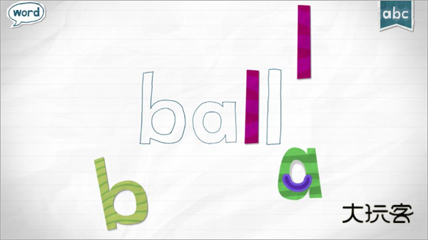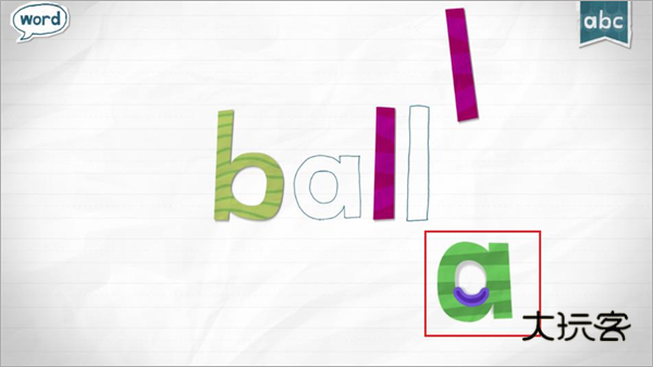 2、点击之后,萌系小怪物们就会把几个字母搬进屏幕,然后你就可以带着你的孩子正是开始英文单词学习喽。把每个字母填进相应的空缺中去,就完成了一个字母的挑战。