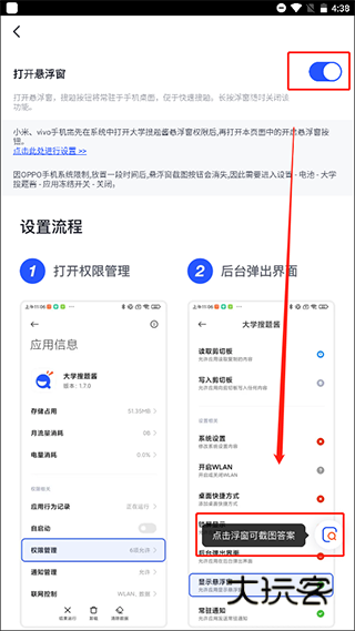 3、查找答案浮动窗口:手机在线答题如何查看答案?打开浮动窗口查找答案,截图搜索问题更方便。