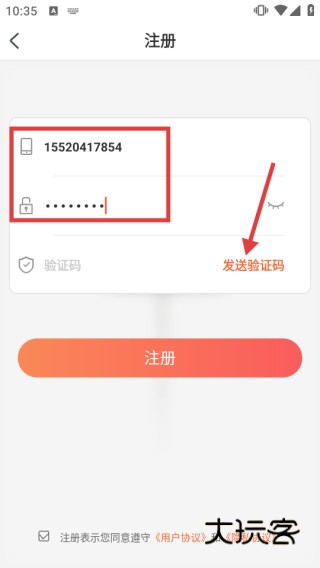 2、在注册页,填写手机号、密码后,点击【发送验证码】获取短信验证码。