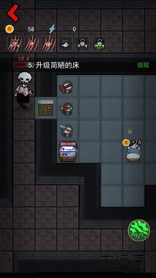 5、在倒计时5秒的时候升级床,然后升2级门,如果鬼先攻击我们,我们就建立武器,然后升级门,门快击破时可以点修复键。