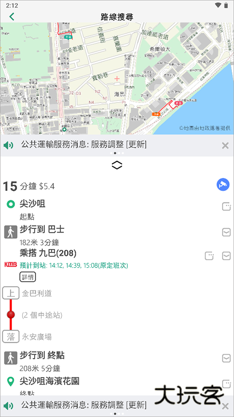 2. 香港旅游搬迁图显示出发地、目的地、上下站和转运站的位置