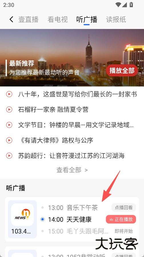 2、在软件内打开听广播功能,可收听推荐音频与实时广播节目。
