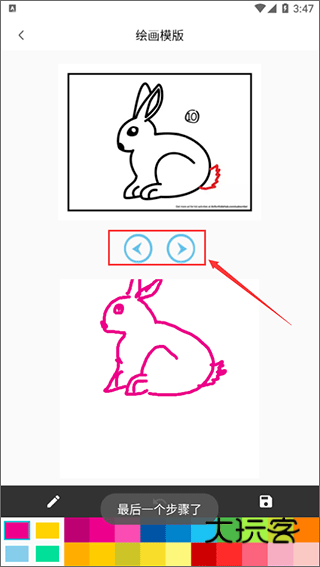 3、当前页面上方的画板是绘画教程,点击画板下方的按钮可以切换前后步骤,下方的画板我们可以跟着步骤进行创作;