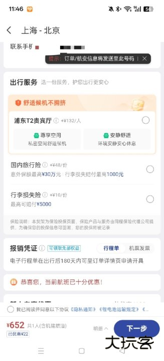 6、完成支付后,手机会收到改航班的值机信息,做好充分的出发准备后前往即可。。