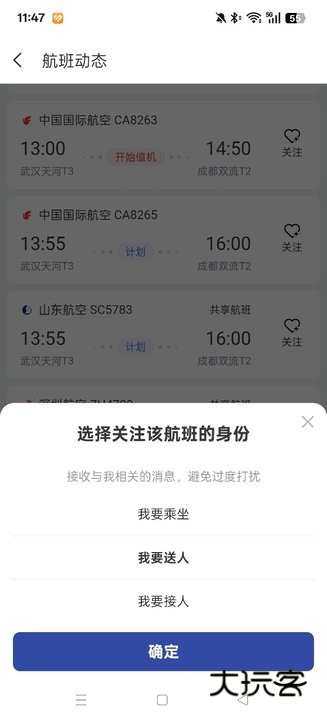 3、选择关注该次航班的身份,完成后点击航班信息明细后的爱心完成关注的添加。