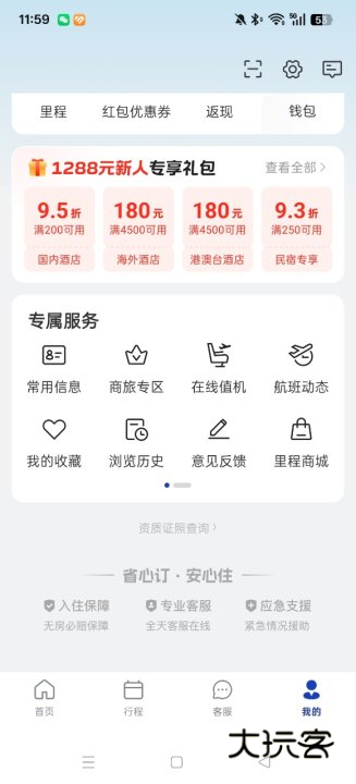 1、登录手机端APP后,点击我的,选择专属服务栏“航班动态”。