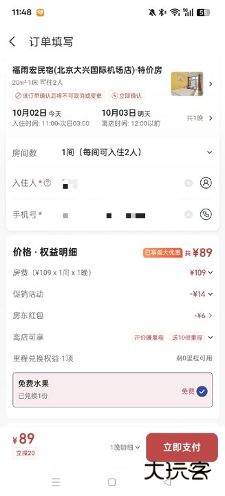 3、确定预订点击“立即预订”,支付相应费用,在订单信息界面输入入住人及各项信息即可。