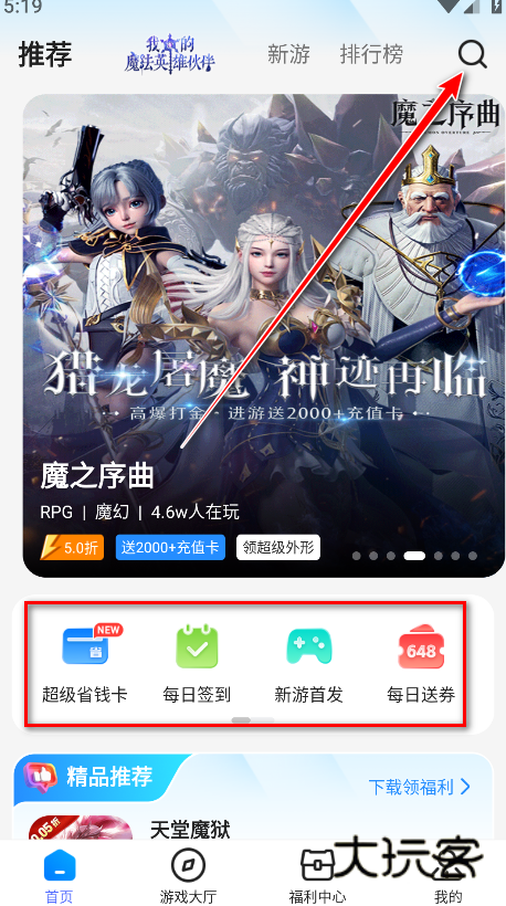 1.打开BT狗游戏盒,可以看到首页有着超级省钱卡、每日签到、新游首发、每日送券等板块内容。点击右上角的放大镜。输入关键字,就可以找到自己想玩的游戏。