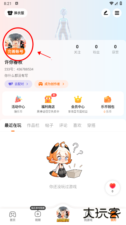 然后点击头像,完善账号;