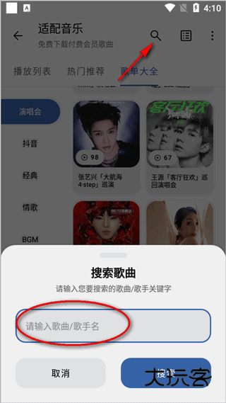 2、点击搜索可以输入歌曲或者歌手名;