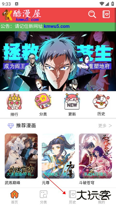 1、进入酷漫屋app后,点击历史选项