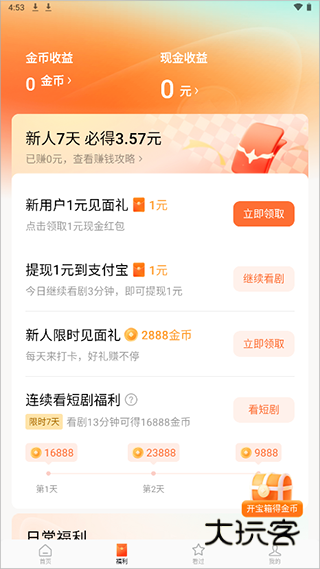 新用户进行应用的福利页面可以领取到7天登录礼;