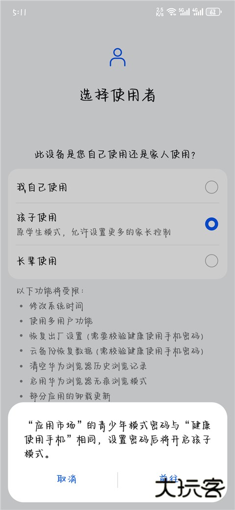 3、根据你的身份选择家长还是设置密码,并设置相应的年龄限制;