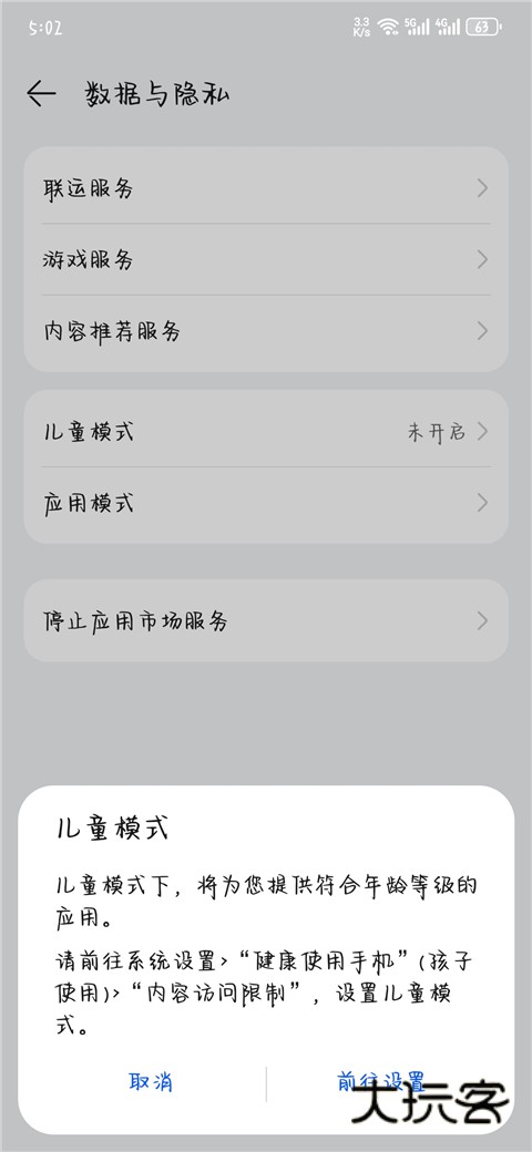 2、进入“个人中心”后,点击“设置”,现在数据与隐私中的儿童模式”;