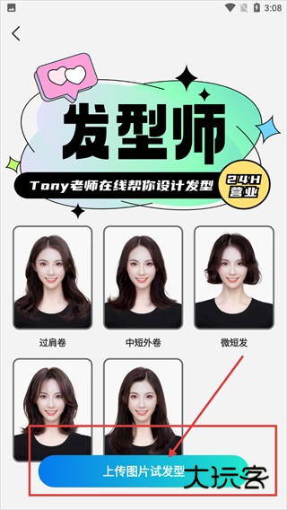 3、在【发型师】页面,可查看【过肩卷】【中短外卷】等发型样式,点击【上传图片试发型】按钮。