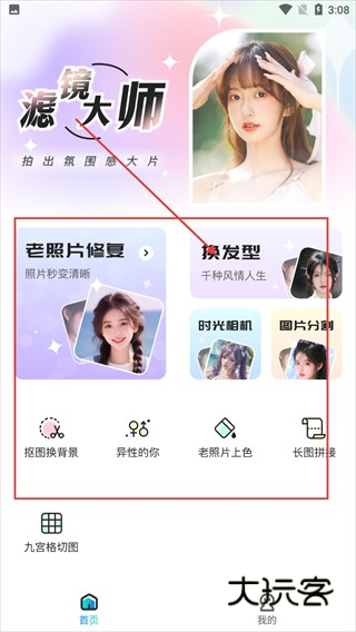 2、进入首页后,能看到【滤镜大师】相关功能区域,选择自己需要的,比如:点击【换发型】选项。