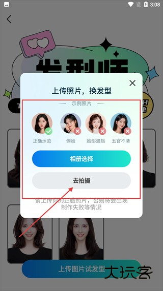 4、弹出【上传照片,换发型】窗口后,可根据需求选择【相册选择】从相册选图,或点击【去拍摄】直接拍摄正脸照片。