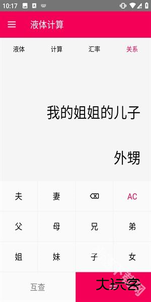 4、关系这里可以计算家里亲戚之间的关系,输入对于的称呼点击等于即可查询出来。