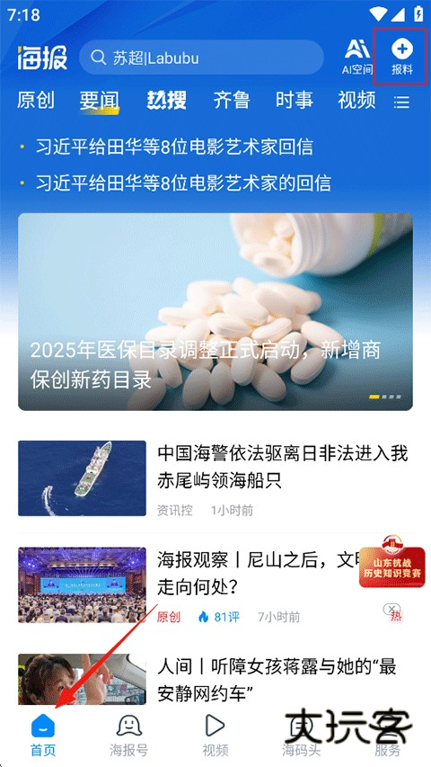 1、打开海报新闻APP,在首页点击右上角的爆料按钮;