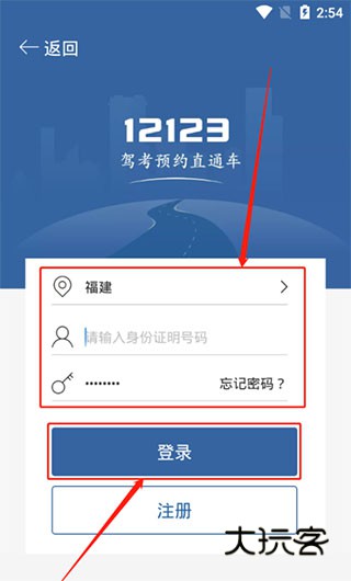 4、这边需要登录一下,选择自己驾考报名的省份,填写要查询的人身份证号和交管12123的密码。