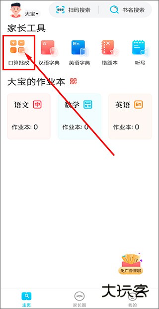 1、 打开作业精灵,进入软件后在主页我们就能看到口算批改、汉语字典、英语字典、错题本等家长工具,点击“口算批改”进入;