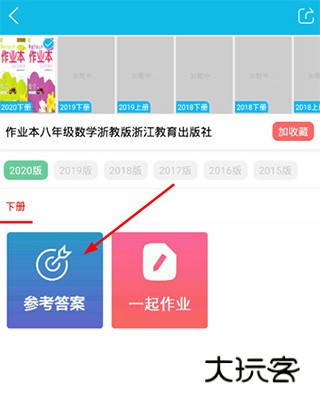 2、进入到此作业本的界面,每个出版社都有不同的年份的书本,点击其中的“参考答案”即可开始查看答案,点击其中的“参考答案”。