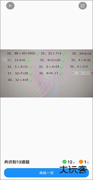 3、最后等待系统数秒,即可快速高效的批改孩子的口算作业,识别正确率也是非常高的,如果有多页也可以直接点击“再批一页”进行拍照。