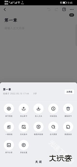 8、软件编辑界面功能也不少,在目录旁边的三个点,点击就可以打开,我们看看有哪些功能,章节预览、导出章节、导入文本、详细的信息、删除章节、一键排版等功能,功能都是创作必用的。