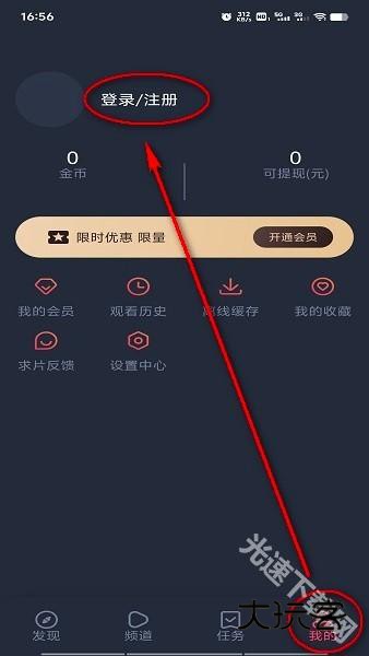 进入打驴动漫后,点击底部最右边的“我的”,进入以后点击上方的“登录/注册”;