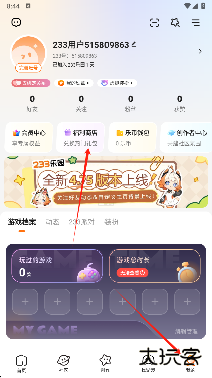 1、打开手机上的233乐园,之后点击我的