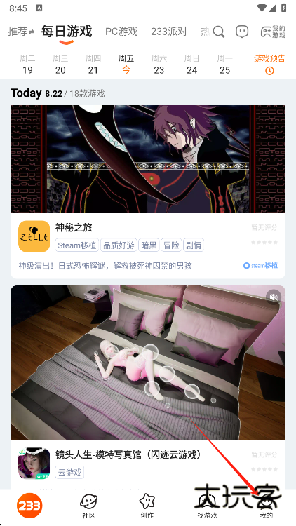 1、首先需要下载安装233乐园,进入软件之后,点击“我的”板块;