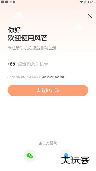 1、同大多数应用软件一样,想要体验“风芒”App更多功能,需要先进行注册。这里支持手机号注册,也支持微信、QQ第三方平台授权登录。