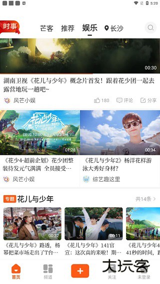 2、登录完成后,在首页将有“芒客”、“推荐”和“娱乐”选项,通过芒客可以跟进社会热点,资讯快人一步。