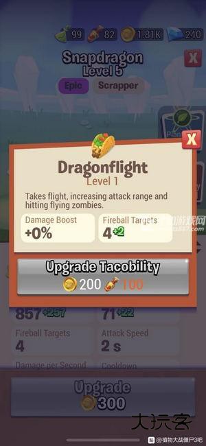 3、火龙草是完美的新手神器,大伤害大范围攻击,使用玉米卷后可以攻击飞行目标,扩大火焰范围,PF攻击巨大。刚开始靠火龙草和杨桃可以撑