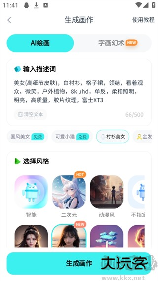 4、进入画作生成处,只需在输入描述词处将自己想象的画面填入,然后选择限制图片类型,完成后点击生成画作;