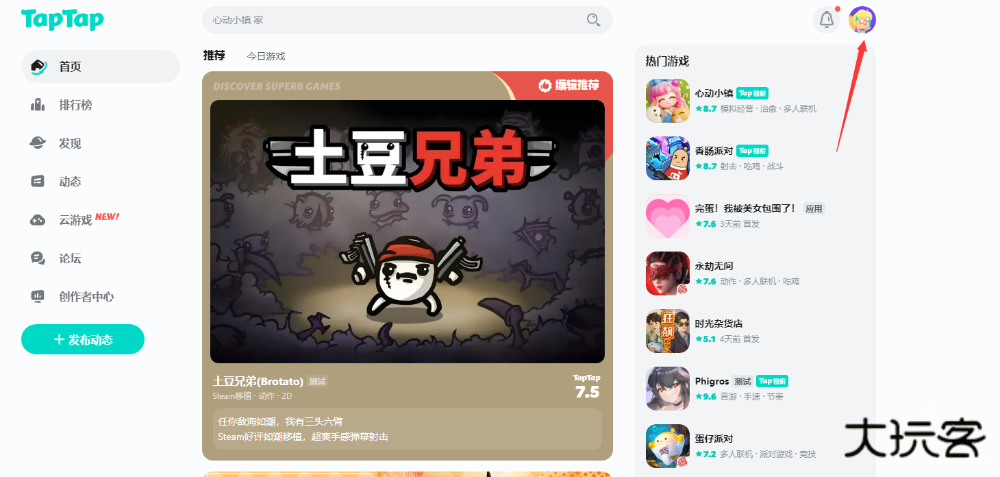 1、打开toptop(taptap)网页https://www.taptap.cn/后,登录要退款游戏的账号,点击右上角的头像