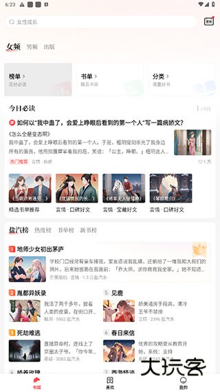 1、下载进入软件就能看到排版简洁清晰的主界面,主题可以选择男频、女频或是已出版的书籍,用户可按自己喜好选择