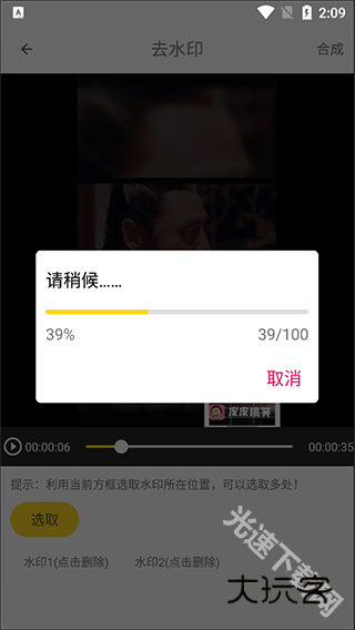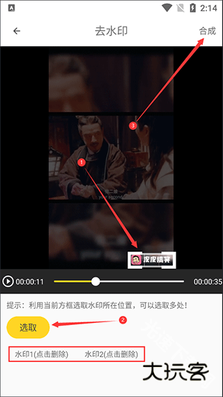 3、将方框拉至水印所在位置,点击选取即可,如果有多处水印,可以多次选取,选取完成后点击合成;
