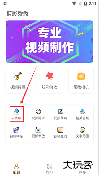 1、打开剪影秀秀app,在【剪辑】页,我们可以看到【视频剪辑】、【炫彩特效】、【超级相机】、【去水印】等各种功能,选择【去水印】功能,点击进入;