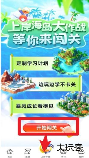3、在“上岸作战”界面点击红色按钮「开始闯关」,解锁学习地图,跟随关卡任务高效进阶备考。