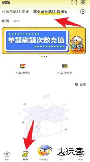 2、点选下方导航栏的「刷题」图标,再进入所选考试类别(如事业单位笔试-联考A),即可进行专项练习。