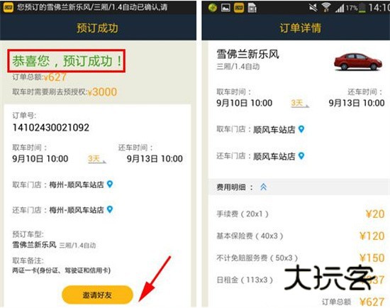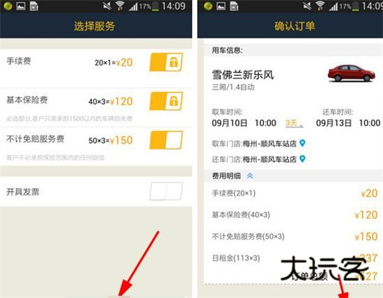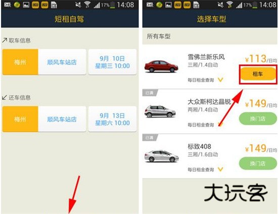 2、输入取/还车信息后点击【去选车】,选择好车型点击【租车】。